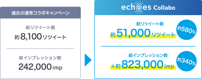 また、沢の鶴社が、以前Twitter上で他社と(インスタントウィンを利用しない)コラボキャンペーンを実施した際の成果と比較すると、今回のechoes Collaboを活用したインスタントウィン形式のコラボキャンペーンの総リツイート数は580%、総インプレッション数は340%となり、従来の(インスタントウィンを利用しない)コラボキャンペーンよりも高い成果につながりました。