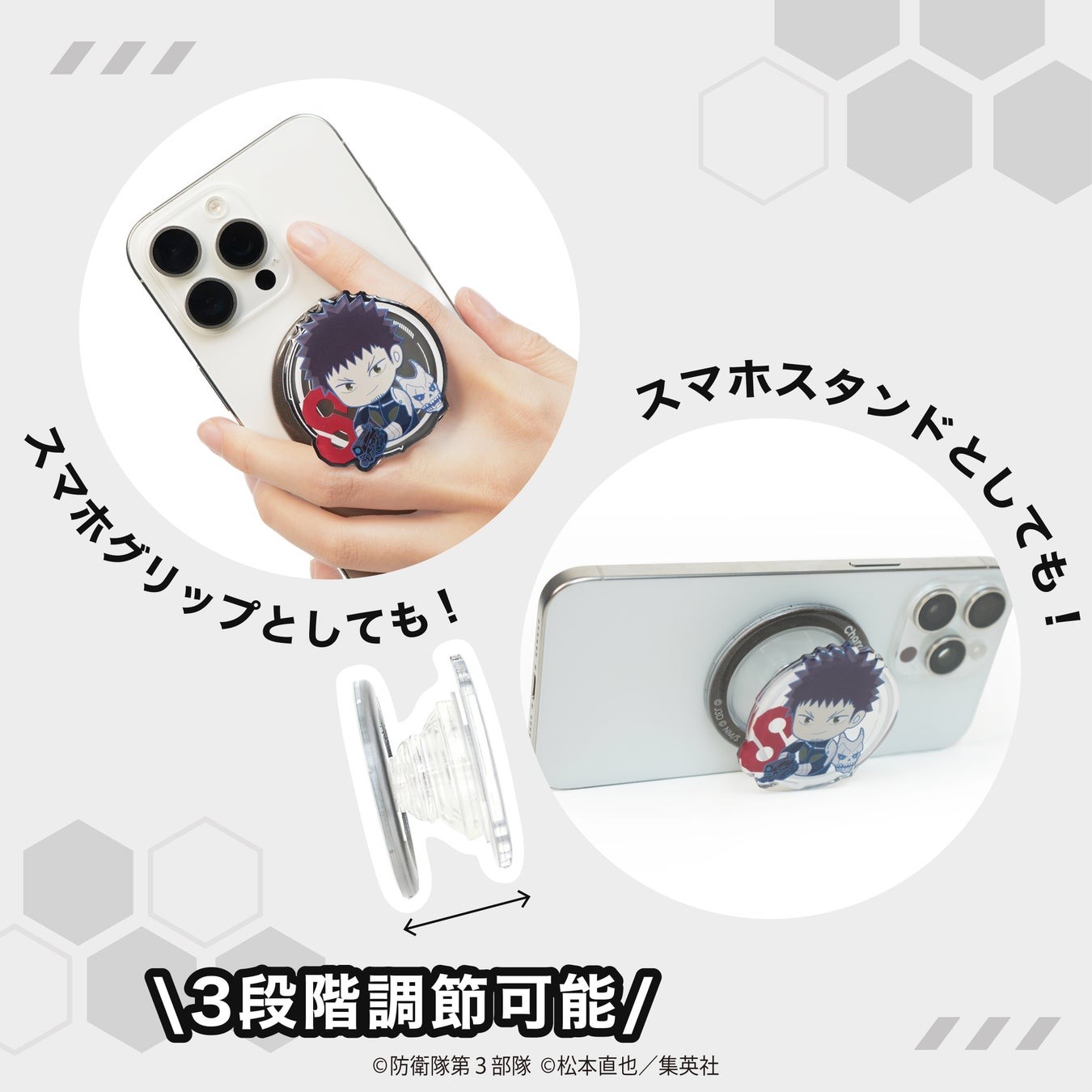 アニメ『怪獣8号』がスマホグリップになって登場!落下防止や片手操作、スタンド機能、撮影時の手ブレ防止までサポート。高さは3段階に調節可能、使わない時は折りたたんでコンパクトに畳めます。マグネットで装着するだけの簡単取り付け、取り外し♪