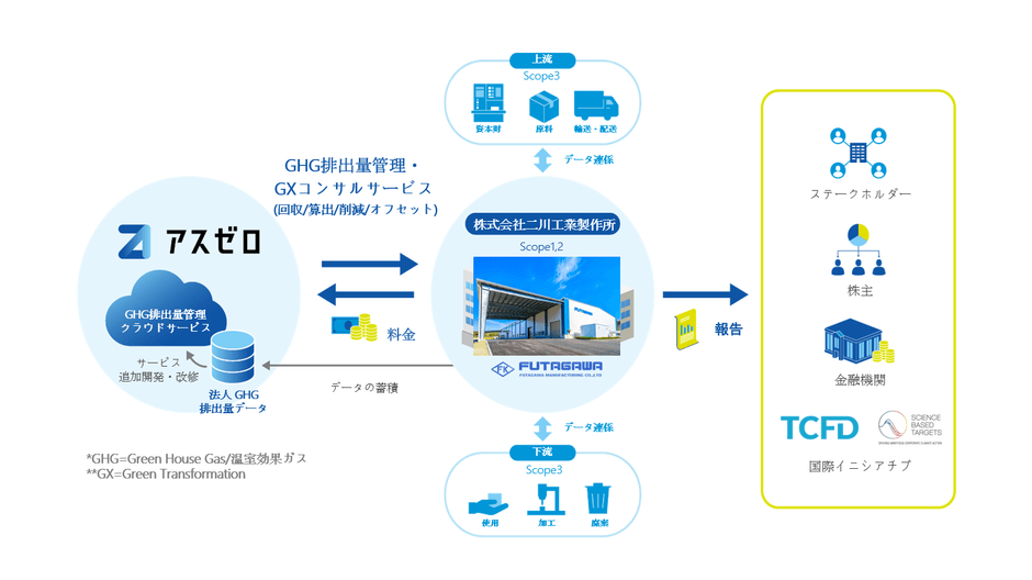 株式会社二川工業製作所(兵庫県加古川市、代表取締役:二川 昌也)は、アスエネ株式会社(東京都品川区、代表取締役CEO:西和田 浩平)の温室効果ガス(「GHG」)排出量管理クラウドサービス「アスゼロ」を導入し、自社及びサプライチェーン全体から排出される温室効果ガスの見える化、さらなる脱炭素社会の創造を先導します。