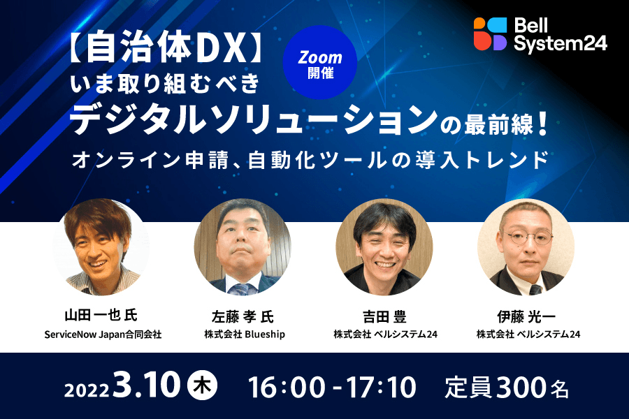 株式会社ベルシステム24(本社:東京都港区、代表取締役 社長執行役員:野田 俊介、以下:ベルシステム24)は、2022年3月10日(木)、「【自治体DX】いま取り組むべきデジタルソリューションの最前線!~オンライン申請、自動化ツールの導入トレンド~(以下、本セミナー)」と題した自治体向けのオンラインセミナーを開催します。