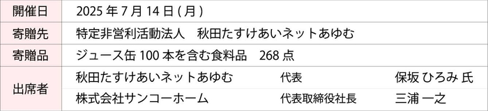 この活動で社員やオーナー様から寄せられた食料品を、生活困窮者支援を行う特定非営利活動法人秋田たすけあいネットあゆむへ寄贈し、2025年7月14日(月)に寄贈式を行いました。