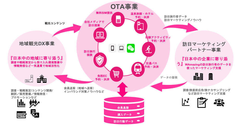 WAmazingは2016年7月創業の訪日外国人旅行者向け観光プラットフォームサービスを展開するスタートアップ企業。WEB、App、WeChatにてサービスを提供しており、日本観光における5大消費(宿泊・観光体験・買い物・交通・飲食)の一元的な予約手配を実現。国際線定期便就航がある日本国内22空港において無料SIM配布端末を設置し、無料SIMカードを提供し会員を拡大させている。主なサービス提供地域である中国、香港、台湾に加え、東南アジア諸国、オーストラリア。また、コロナ禍を受けて新たに立ち上げた翻訳事業、地域観光DX事業も順調に成長。