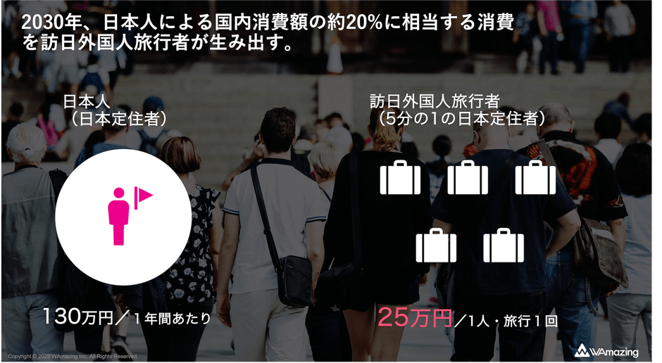 移民政策をとっていない日本にとって訪日外国人旅行者の日本国内消費は観光関連事業者のみならず全ての日本企業にとって「5分の1の日本人消費」をもたらす存在になるでしょう。WAmazingは訪日外国人旅行者と日本企業をマッチングするスタートアップとして、日本企業の売上向上支援をサポートしていきたいと思います。