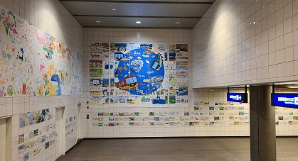 ▲京阪Kids絵画展の展示の様子(大江橋駅)【2021年】 ▲車内展示【2021年】