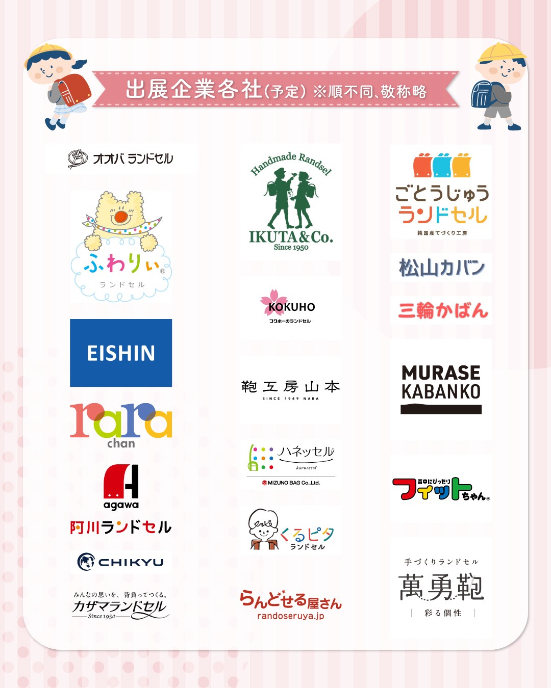 現在、少子化の影響を受けるランドセル市場において、各メーカーは高品質化や機能性の向上に注力し、「ラン活」(ランドセル選び活動)の早期化・多様化が進んでいます。こうした背景のもと、ランドセル工業会では業界全体の活性化と消費者への情報提供を目的に、メーカー20社が一堂に会する業界最大規模の展示会を開催します。