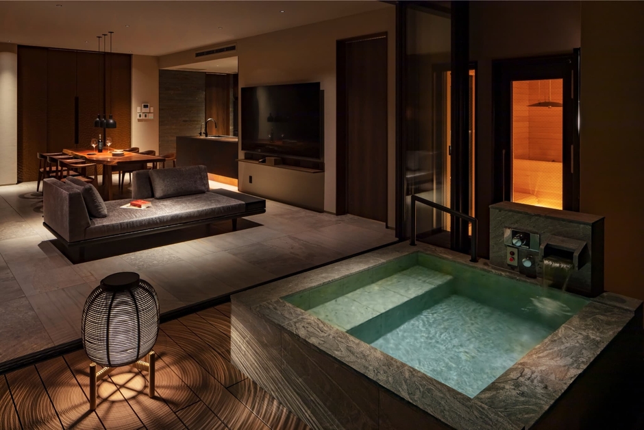 客室内には、和紙や柿渋などの日本の伝統的な素材や、土・木・石などの自然素材を使用し、現代のデザインやテクノロジーを融合させた、快適で斬新な宿泊体験を提供しています。中でも和紙をふんだんに使用したモダンな内装は和紙職人・ハタノワタル氏の手仕事により完成した唯一無二の空間となっています。