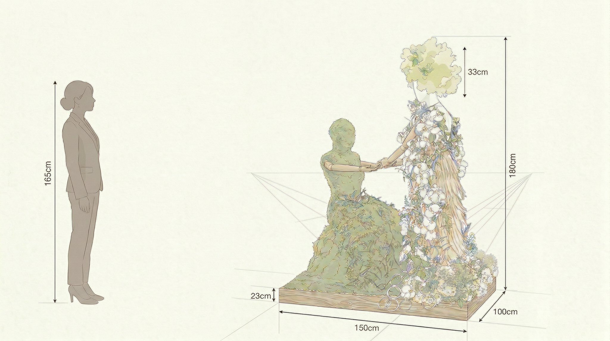 苔むした造形で“これまでの自分”を、そこから立ち上がる花の構造体で“自ら変化し続ける意志”を表現し、過去・現在・未来を内包する人の変容を、花と空間によって描き出しました。