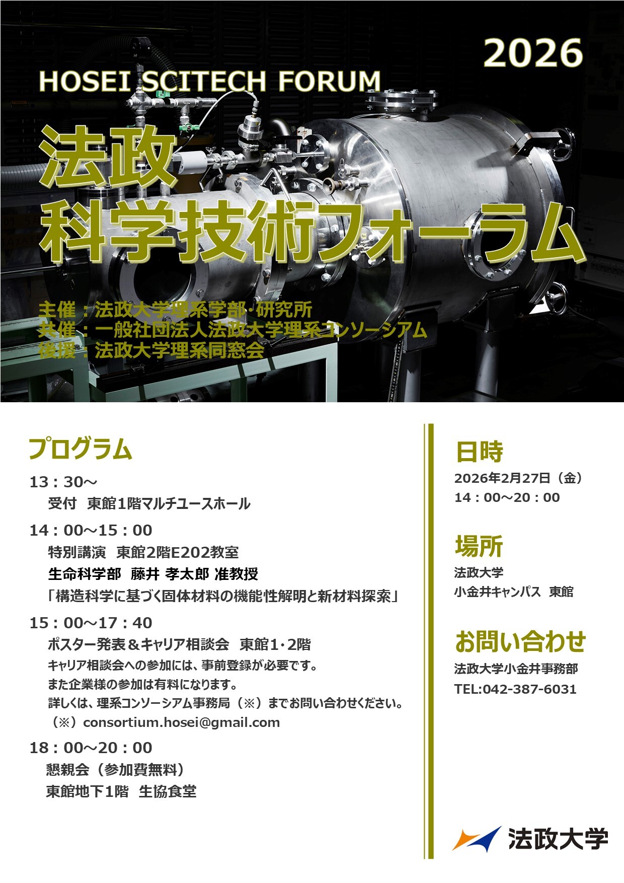 法政大学は、理系の大学院・学部・研究所に所属する学生が自身の研究内容とその成果を紹介する「法政科学技術フォーラム2026」を、2026年2月27日(金)に法政大学小金井キャンパスで開催します。(主催:法政大学理系学部・研究所/共催:一般社団法人法政大学理系コンソーシアム/後援:法政大学理系同窓会)