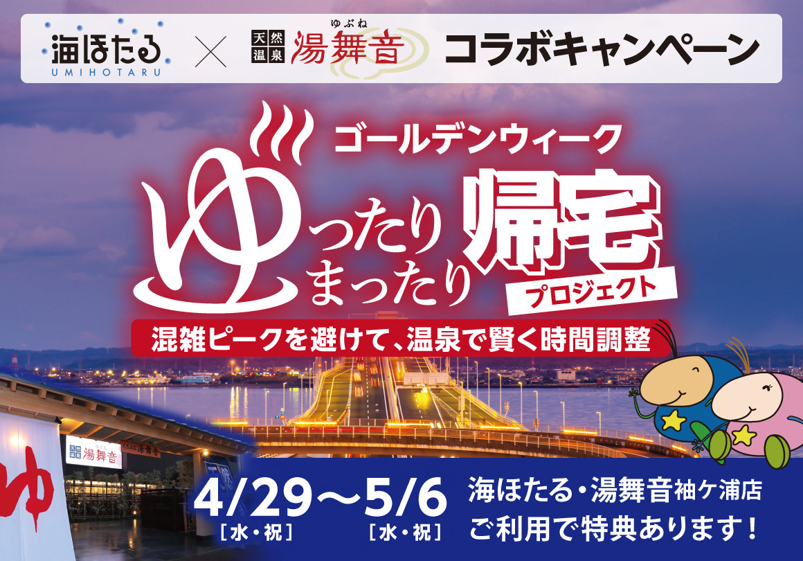 株式会社楽久屋(本社:東京都港区、代表取締役:新井 正一)が運営する『湯舞音 袖ケ浦店』は、2026年4月29日(水・祝)~2026年5月6日(水・祝)の期間、**「ゴールデンウィーク ゆったりまったり帰宅プロジェクト」**を開催いたします。