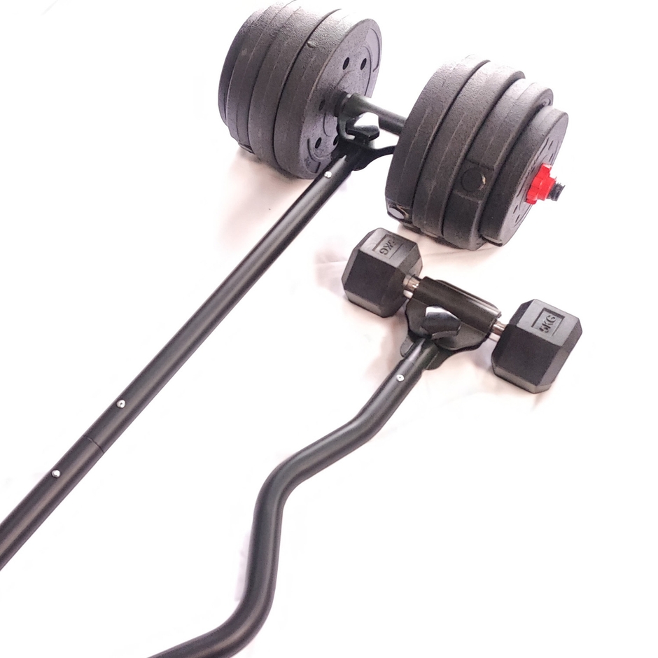 KOMBOバーベルはウエイトプレートや長いシャフトを揃える必要がなく、お持ちのダンベルを取り付けるだけでバーベルになる全く新しい商品です。
