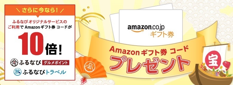12月1日より、ふるなびオリジナルサービスである、「ふるなびグルメポイント」「ふるなびトラベル」にご寄附をいただいた皆様には、期間限定でAmazonギフト券 コードを10倍(寄附金額の10%分)をプレゼントいたします。