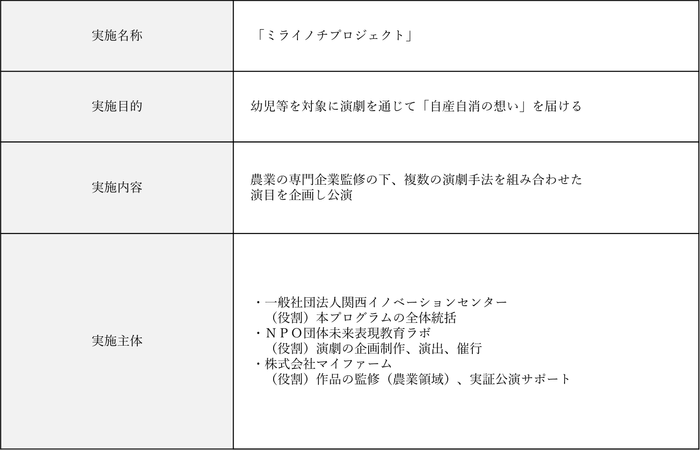 一般社団法人関西イノベーションセンター(代表理事:早乙女(そうとめ) 実(みのる)、以下当社団)と、株式会社マイファーム(代表取締役:西辻(にしつじ) 一真(かずま)、以下マイファーム)、NPO団体未来表現教育ラボ(代表:大野(おおの) たかよし、以下Mラボ)の3社は共同で、複数の演劇手法を融合させ「自産自消※の想い」を届ける、『ミライノチプロジェクト』を始動いたします。