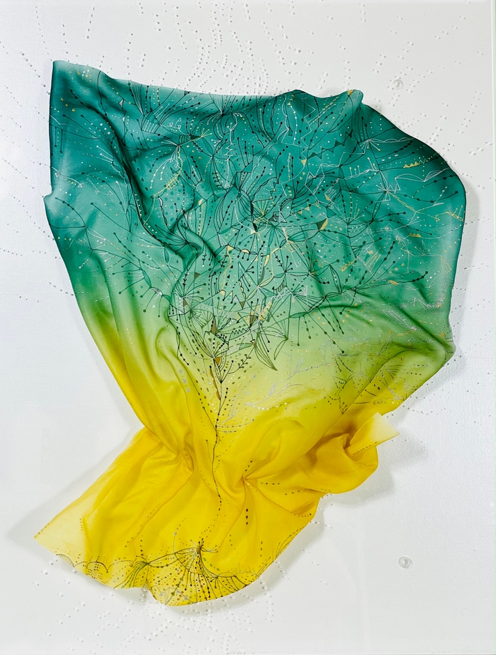 染色作品にレジンを使うことで繊細な動きを閉じこめた点が新しく、美しいグラデーションと