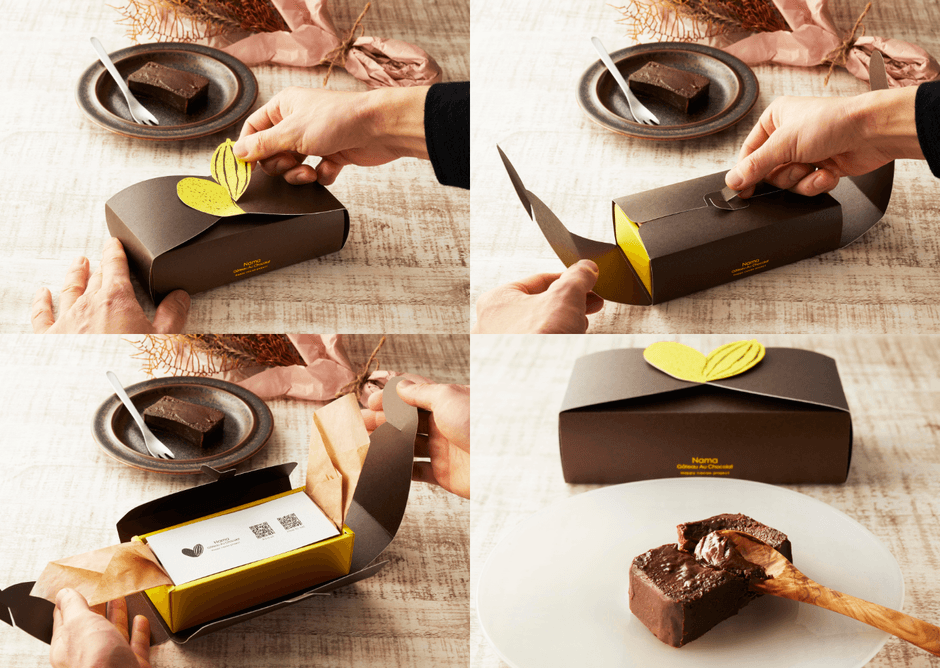 期間限定パッケージは、ナマガトーショコラのロゴマークでもあるカカオマークを重ねて作ったハートが目を引く、黄色とブラウンのコントラストがシックかつ可愛いらしいデザインとなっています。カカオマークが箱を開けるフックになり、開封する工程まで楽しめるパッケージにいたしました。