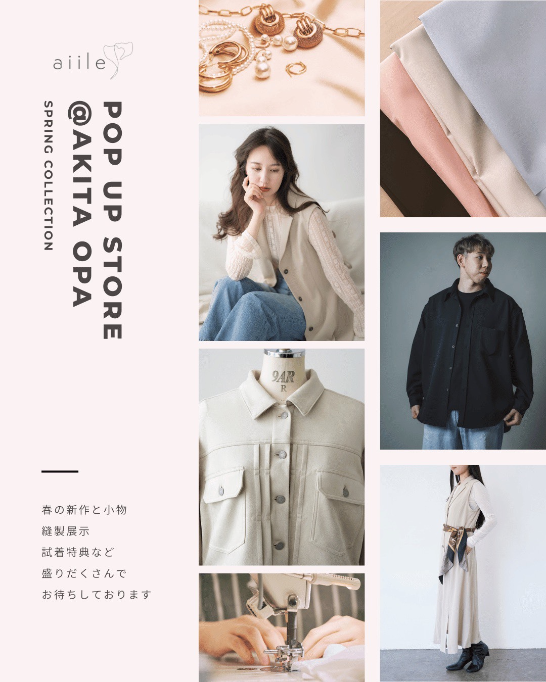 ■秋田県大館市の縫製工場が運営するレディースアパレルブランド「aiile(エイル)」(運営:株式会社SH.K.PRODUCT)は、2026年3月20日(金・祝)から22日(日)までの3日間、秋田OPA 1階にてPOP UP STOREを開催いたします。