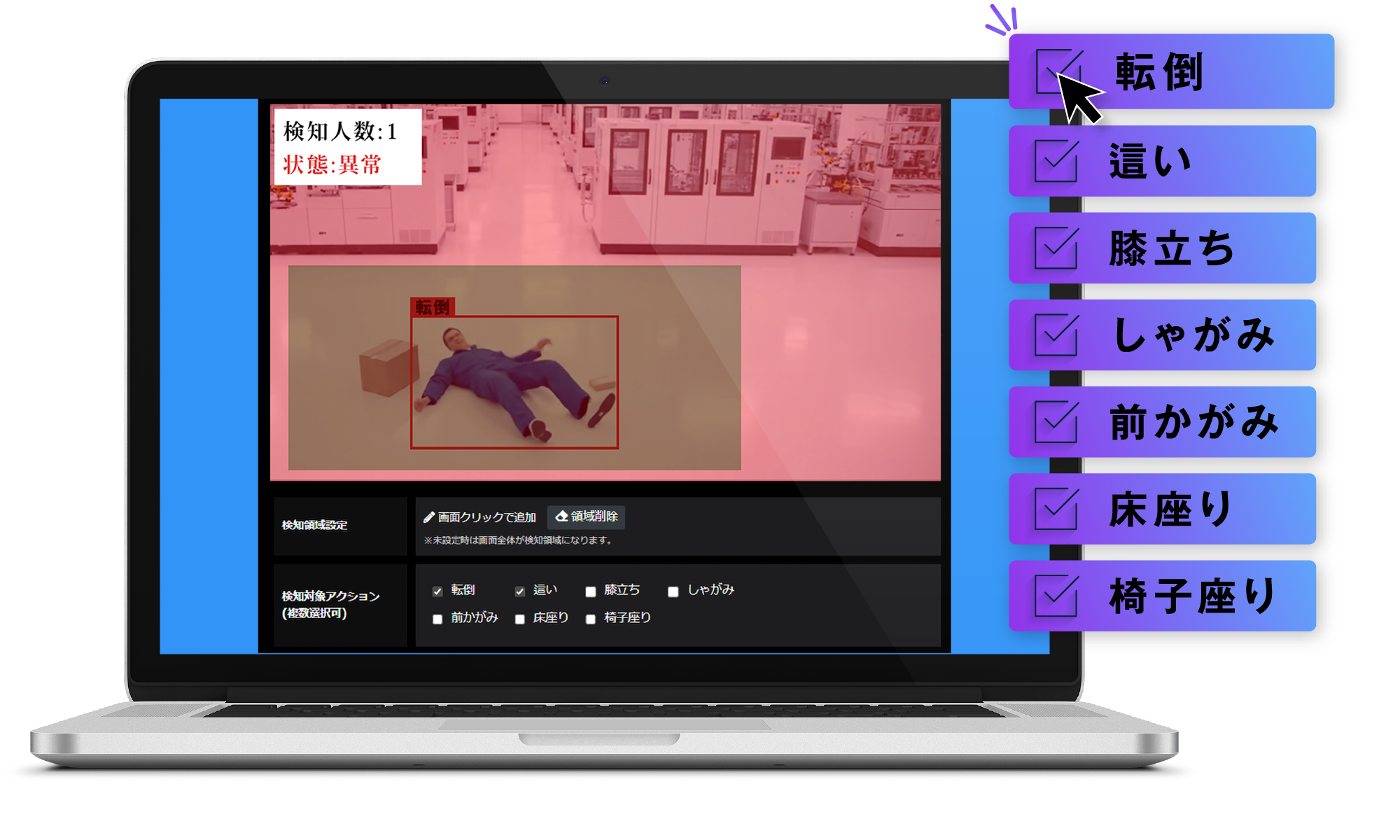 検知したい対象の行動は、設定画面のチェックボックス操作で簡単にオン/オフの設定ができます。直感的なインターフェースはわかりやすく、操作も簡単です。現場に合わせたカスタマイズが、専用の知識不要で可能になります。