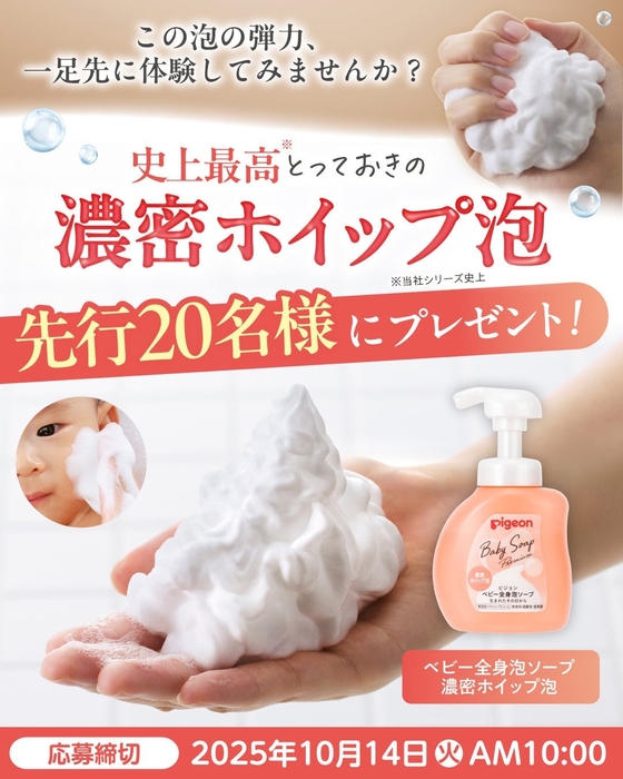 ピジョン株式会社(本社:東京、社長:矢野 亮)は、シリーズ史上最高(※1)の弾力もちもち泡で、保湿成分「セラミド」を2倍(※2)配合した、赤ちゃんの肌に負担を与えずやさしく洗える「ベビー全身泡ソープ 濃密ホイップ泡」を、2025年10月27日(月)より全国のベビー用品専門店・ドラッグストア、当社公式オンラインショップにて販売します。また、発売を記念し、抽選で20名様に本商品が当たるキャンペーンを開催いたします。