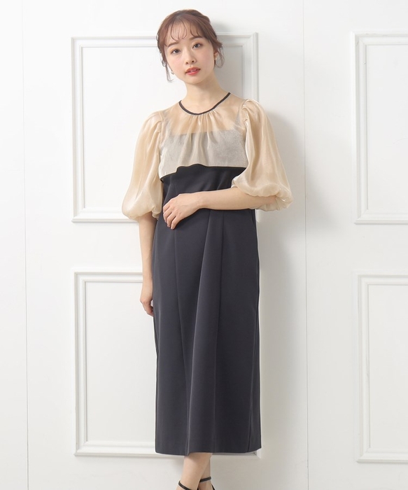 上品な光沢感のシアーなオーガンジーのショートトップスと程よい厚さ&生地表面が滑らかで美しいダブルクロス素材のワンピースがセットになった3WAYワンピース。