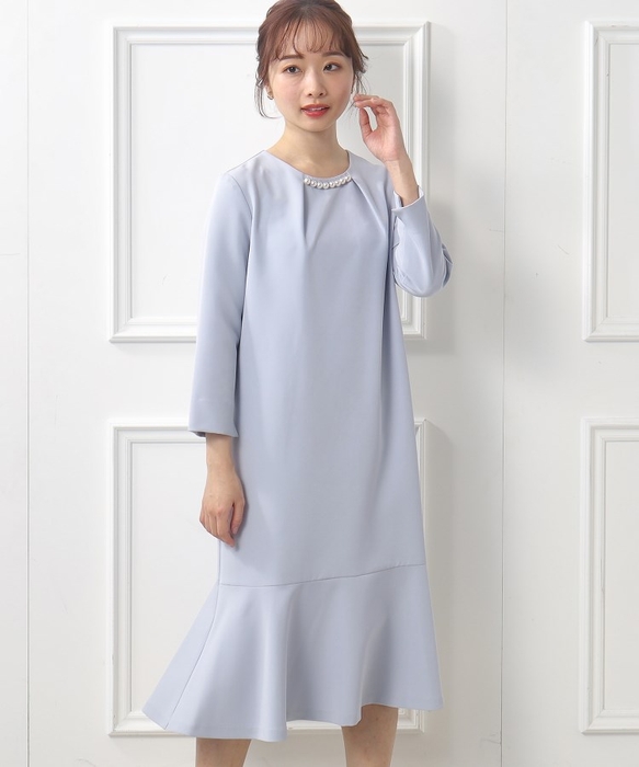 首元に大ぶりなパール調の付属が付いた華やかなワンピース。