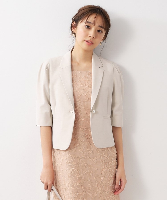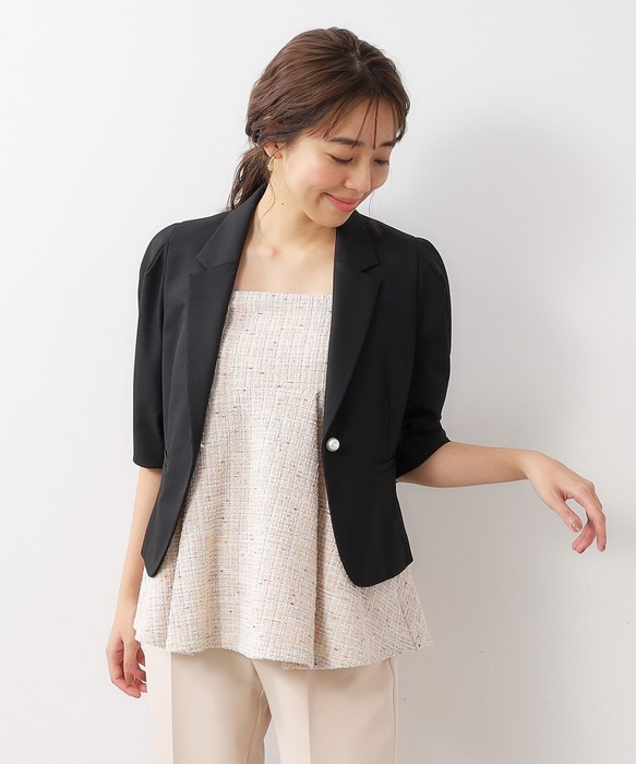 パール調ボタンがアクセントのタックスリーブ半袖ジャケット。