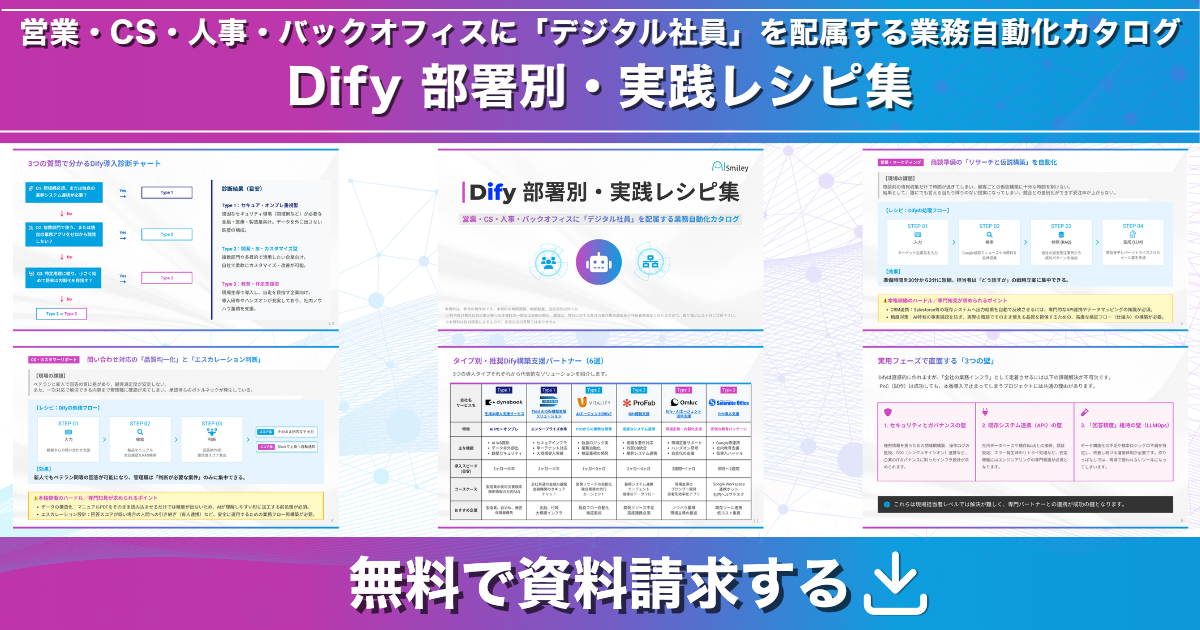 国内最大級のAIポータルメディア「AIsmiley」を運営する株式会社アイスマイリー(東京都渋谷区、代表取締役:板羽 晃司)は、各部署に「デジタル社員」を配属し、業務の自律的な実行を支援する「Dify 部署別・実践レシピ集」を、2026年3月31日(火)に公開しました。