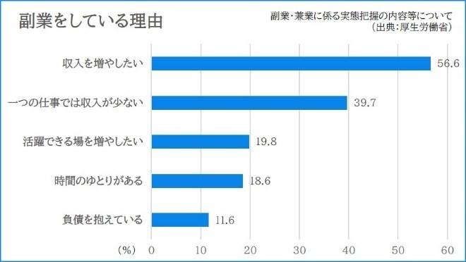 2020年に厚生労働省が行った調査によると、本業とは別に仕事をする“副業”をしている人の数は全体の9.7%。つまり約10人に1人が副業をしており、その理由としては「収入を増やしたいから」「一つの仕事だけでは収入が少なすぎて生活ができないから」など経済的理由が大半を占めていることがわかりました。