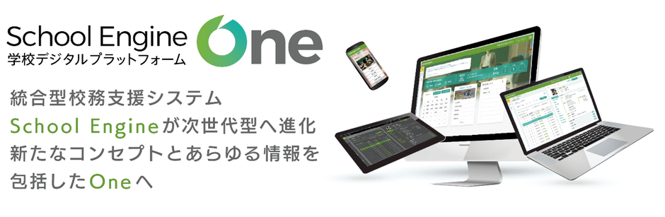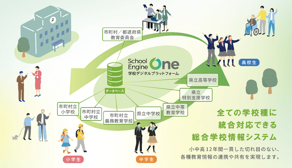 『School Engine One』は、都道府県立学校から市町村立学校まで、すべての学校種(小学校・中学校・高等学校・特別支援学校など)に関わる校務支援、グループウェア、Webサービスなどの機能を一つのシステムに統合し、教職員だけでなく、保護者や児童・生徒を含む地域社会すべての関係者にご利用いただける、学校デジタルプラットフォームの実現を目指し、開発を進めています。