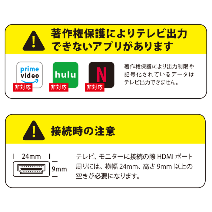 デバイスとディスプレイを繋ぐだけの簡単接続設計です。 prime video / hulu /Netflix など著作権保護により出力制限や記号化されてデータはテレビ出力ができませんのでご了承ください。
