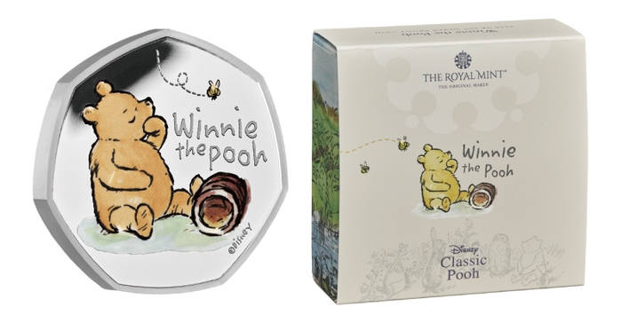 当シリーズは、英国の児童文学作家A・A(アラン・アレクサンダー)・ミルンによる古典的な童話と、挿絵画家E・H(アーネスト・ハワード)・シェパードによるイラストから生まれた、プーさんとその仲間の物語をコインに刻んでいきます。オリジナルの本を愛するファンにとって、ノスタルジーをかき立てるデザインになっています。今回ご案内するラインナップは、いずれも額面50ペンスの金・銀・白銅貨の3種類。シリーズ最初のデザインは、物語に添えられたE・H・シェパードによる挿絵通りのプーさんの姿が、各コインに表現されました。