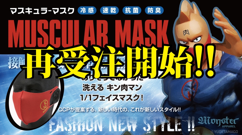 フィギュアメーカーのCCP株式会社(所在地:東京都足立区、代表取締役社長:延藤 なおき)は、人気漫画作品「キン肉マン」に登場するキャラクターをイメージしたデザインを施したマスク『CCP MUSCULER MASK(CMM)』を、2020年7月1日~2020年7月6日午前10時までの期間で株式会社ワールドフォトプレスの運営する通販サイト「mono shop」にて先行予約を再受付いたします。
