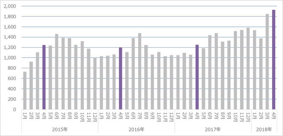 〈ドラッグストア2018年4月のインバウンド消費調査〉 インバウンド消費購買件数54%増で前月に続き過去最高を更新