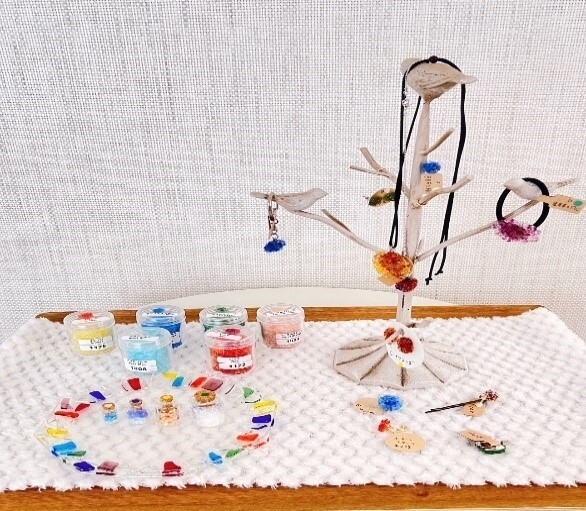 ガラスの形や色・大きさも様々で、ピアスやヘアピン・ブローチやネックレスなど種類も豊富にご用意しており、体験キットをお部屋にお届けするので、初心者の方でも体験しやすいセットです。商品は後日職人が焼き上げて、ご自宅へご郵送いたします。