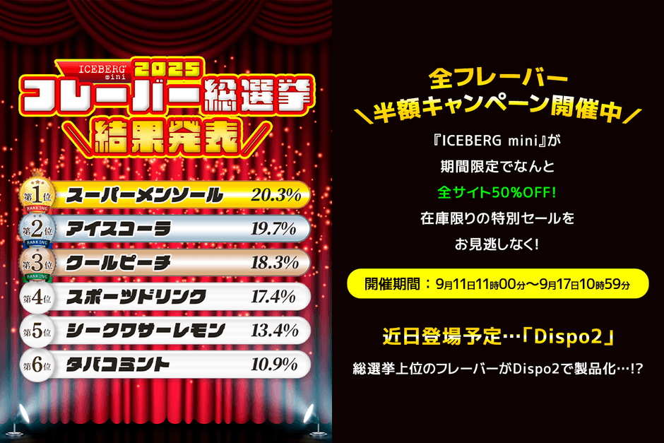 このたび、ユーザー参加型イベント「フレーバー総選挙」の最終結果を発表するとともに、期間限定で【半額キャンペーン】を2025年9月11日(木)~9月17日(水)実施いたします。