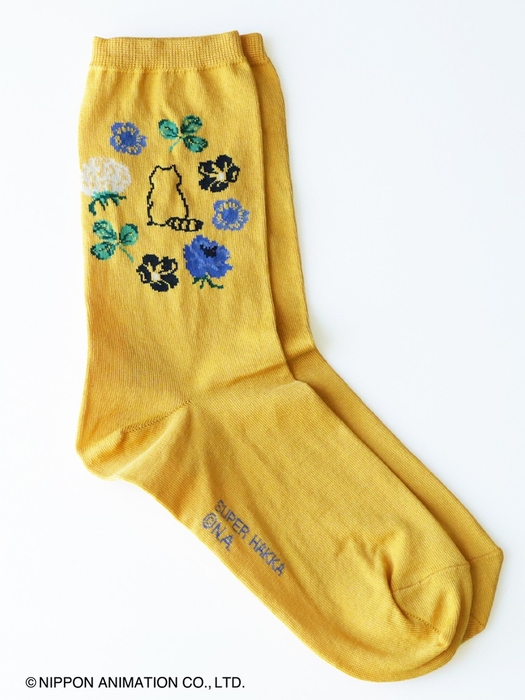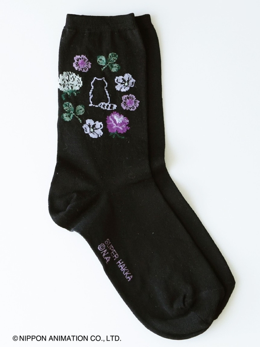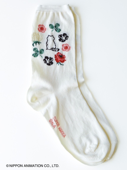 花の輪の中にラスカルを配置した可愛らしい柄を、ジャカードで表現したソックス。「大人でも取り入れやすいキャラクター」を意識して、ラスカルを単色に、周りの花々もシックな色合いでまとめました。ベーシックなオフホワイト、ブラックに、ラスカルカラーのイエローの3色展開です。