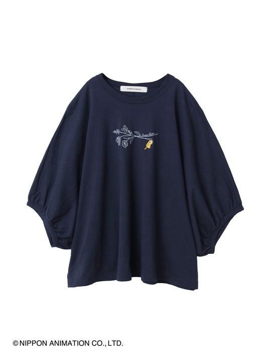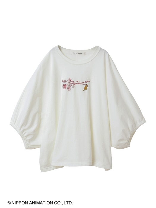 ラスカルとお花の刺繍を施した、ボリュームのあるドルマンスリーブTシャツ。SUPER HAKKAらしい線画のお花の先には、ラスカルがぶら下がっています。程よい丈感でボトムを選ばずスタイリングしていただけます。