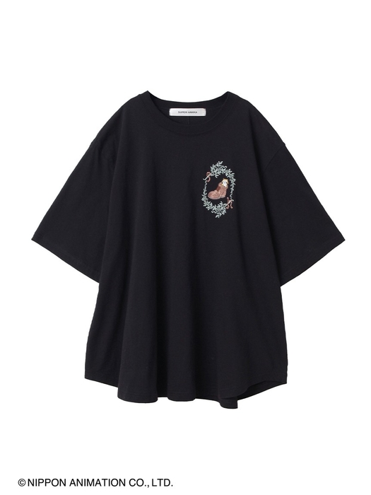 ブーツから顔を出したなんとも可愛い表情のラスカルのモチーフを、刺繍で胸元に施したフレアTシャツ。ボディラインを拾いすぎない程よくフレアなシルエットで、女性らしい柔らかい雰囲気を演出してくれます。クラシカルな蔦のフレームに見えるさりげないSHの文字がポイントです。