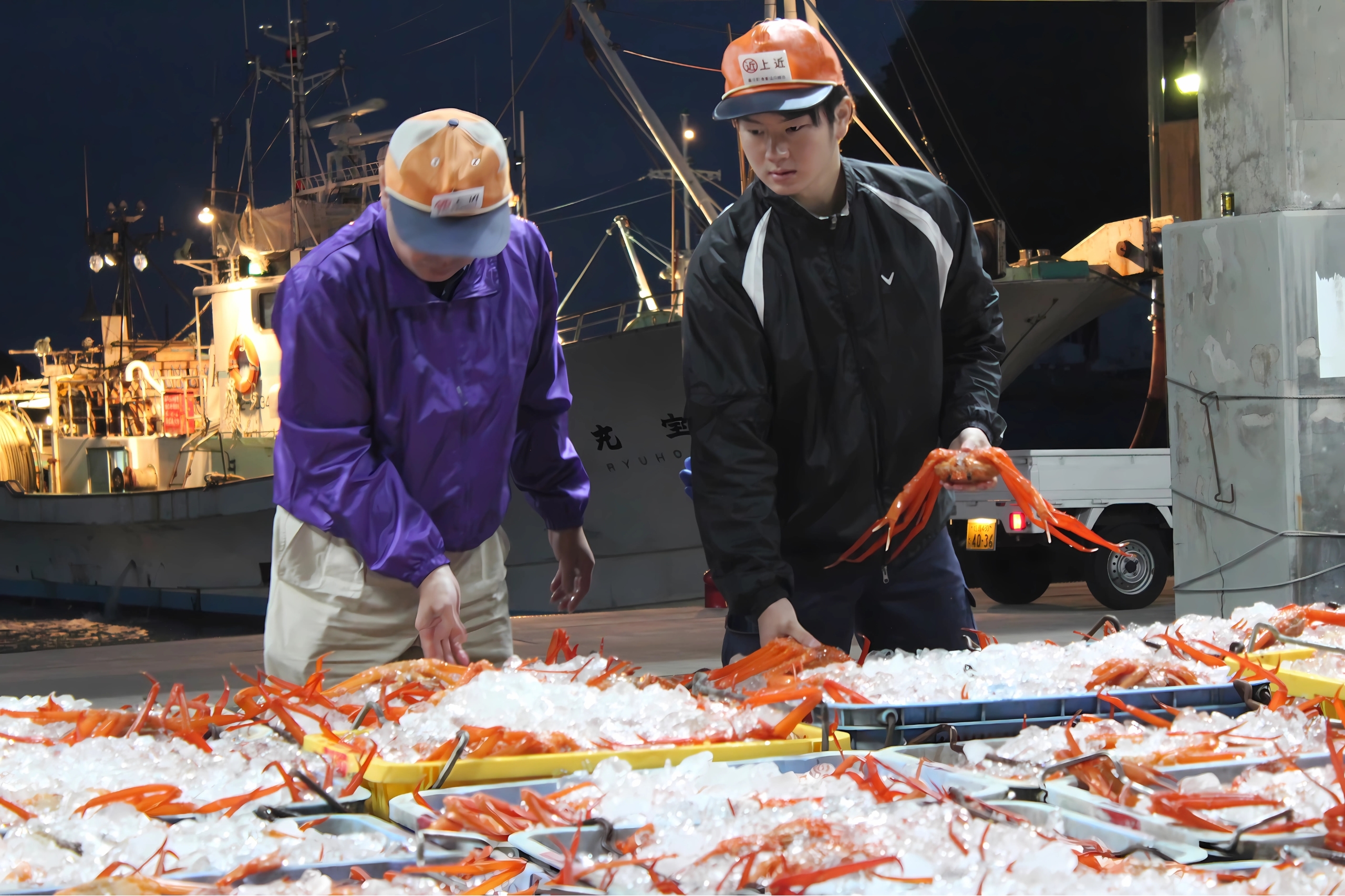 競りの様子。社内でカニの選別技術などを体系化した「カニマイスター制度」も検討している。
