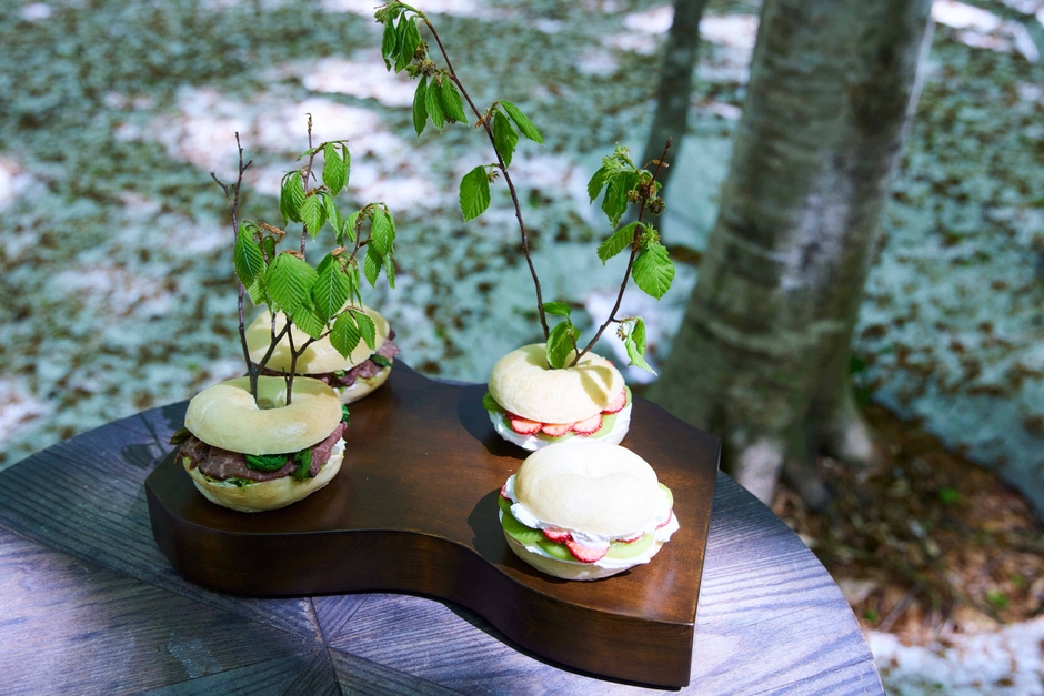 当プログラム限定で、根びらきをイメージしたユニークな見た目の「根びらきベーグルサンド」を提供します。用意したのは、山菜や春キャベツを使用したベーグルサンド、イチゴなどをふんだんに使用した甘いベーグルサンドの2種類です。さらに、新緑と根びらきが織りなす景色を表現した「根びらきドリンク」も楽しめます。りんごと生姜、豆乳をベースにしたホットスムージーの上に、雪のような真っ白なフォームミルクをのせ、中央にココアパウダーをまぶして根びらきを表現したドリンクです。朝日が差す新緑と根びらきの絶景の中で、特製朝食を味わう、特別な時間を過ごせます。