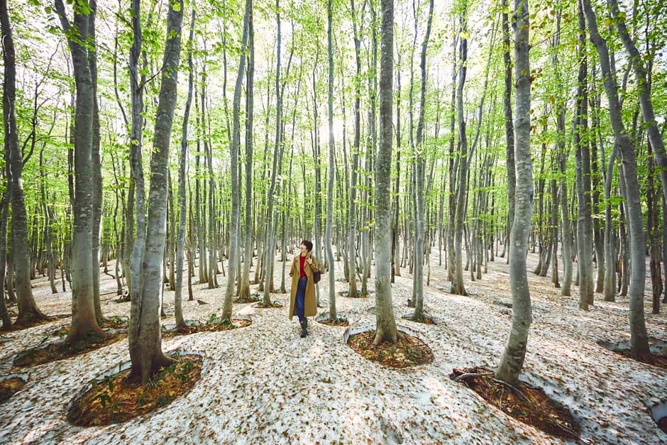本州最北端に位置する青森県では、5月頃に木々が芽吹き、春を迎えます。その頃の森で見られるのが、幹の周りの雪が丸く溶ける現象「根びらき」です。これは、太陽の熱で温められた幹が、その周りの雪を溶かすために起こります。当ホテルから車で20分ほどの場所に広がるブナ林には、見渡す限りの根びらきが広がります。足元に雪原と根びらきが広がり、さらに頭上で新緑がきらめく景色は、約1ヵ月間しか見られない絶景です。当ホテルではこの絶景を余すことなく楽しめるよう、2019年からプログラム「春の根びらきさんぽ」を実施してきました。実施から4年目を迎える2023年は「絶景根びらき朝活」へと名前を変え、根びらきの絶景が広がる空間で、清々しく感動的な朝を迎えられるようになります。