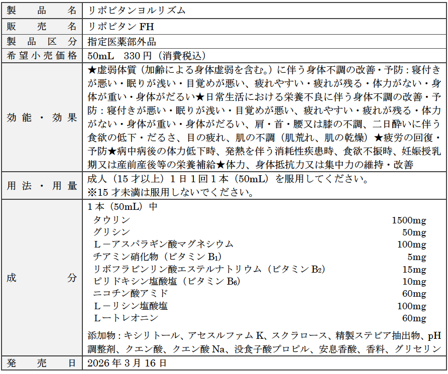 大正製薬株式会社[本社:東京都豊島区 社長:上原 茂](以下、当社)は、「リポビタン」シリーズから、大正製薬独自の処方設計※で、加齢に伴う睡眠の悩みを改善するミニドリンク剤(50mL)の「リポビタンヨルリズム」(指定医薬部外品)を、3月16日(月)より全国で発売いたします。