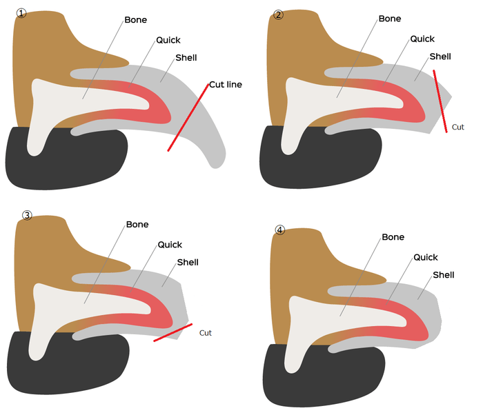 爪が黒い場合、血管の位置がわからない為少しずつ切りましょう。切り進めて行くと説タン部分が半透明になるので、そこまでカットしたらOKです。