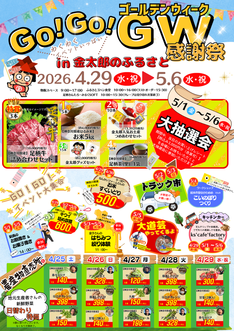 道の駅足柄・金太郎のふるさと(所在地:神奈川県南足柄、運営:株式会社相州村の駅)では、日頃のご愛顧に感謝を込めて、このGWを最高に盛り上げるスペシャルイベント「GO!GO!ゴールデンウィーク感謝祭in金太郎のふるさと」を2026年4月29日(水)~5月6日(水)まで開催いたします。