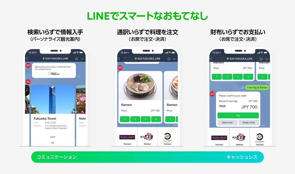 今回G20FUKUOKAのLINE公式アカウントを通してご提供するのは、「LINE」があれば「検索いらずで観光地やお店を知る」「通訳いらずで商品を注文する」「財布いらずで支払いをする」という一連の観光体験がスムーズに進む、「キャッシュレス決済+コミュニケーション」機能です。