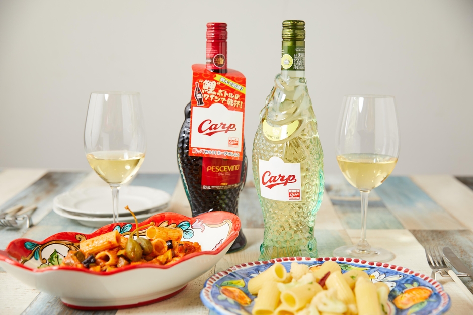 鯉をかたどったボトルが印象的なペッシェヴィーノは、1986年に初めて日本で発売されて以来、イタリアカジュアルワインとして愛されてきました。そして、発売年の1986年といえば、カープがセ・リーグ優勝を果たした年でもあります。そこで、このたびモンテ物産が提案するのは、カープ承認ワインとなったペッシェヴィーノを、カープボトルにデコレーションできる“作るカープボトル”!ペッシェヴィーノに掛けられた専用シールを使って、ワインをご購入いただいたお客様自身でカープロゴ入りボトルにデコレーションしていただけます。ワインを飲んで応援、作って応援、写真に撮って応援!とお好みのスタイルでカープの応援を演出します。