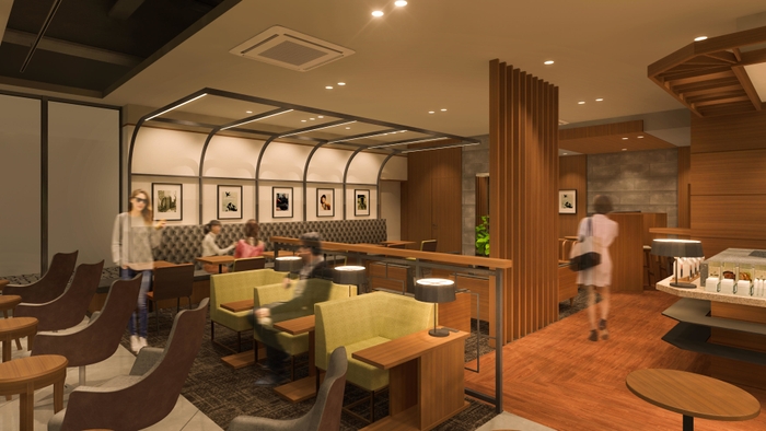 1つ目の「フォーカスゾーン」では、落ち着いた色合いに包まれた空間で、仕事や読書などに集中しながら取り組んでいただけます。2つ目の「コミュニティゾーン」は、誰もが気軽にご利用しやすい明るい開放的なスペースに設計しています。お子さまとご一緒に、ゆったりとコーヒータイムをお楽しみいただくことができます。また、3つ目の「ダイアログゾーン」では、従来の上島珈琲店らしさを感じる空間で、ご友人と語り合う場としても、商談の場としてもご利用いただけるように、同店の中でも数少ない対面席を配置しました。さらに、ハイカウンターや1人席もご用意しておりますので、短時間の気分転換に最適な空間です。