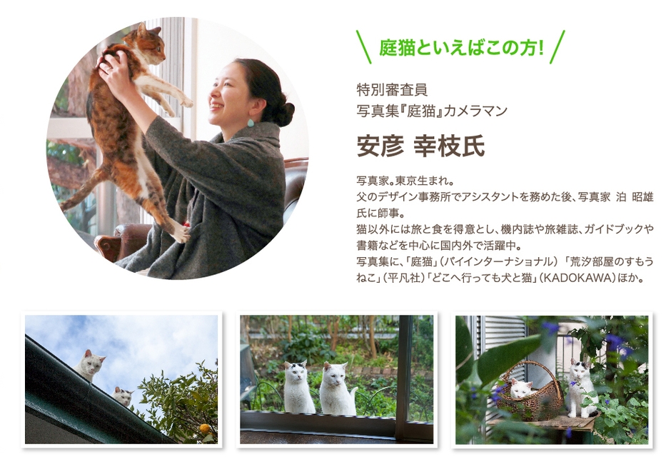 なお、今回は『庭猫』写真集で著名なカメラマン『安彦 幸枝』氏を特別審査員に迎え、“庭×猫(犬)”を募集テーマとして実施いたします。