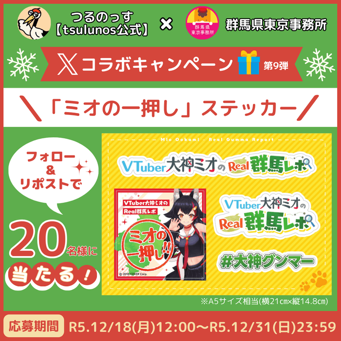 「VTuber大神ミオのReal群馬レポ」特製の非売品ステッカーが当たる!! Xキャンペーンを開催中!12月31日(日)23:59まで!!