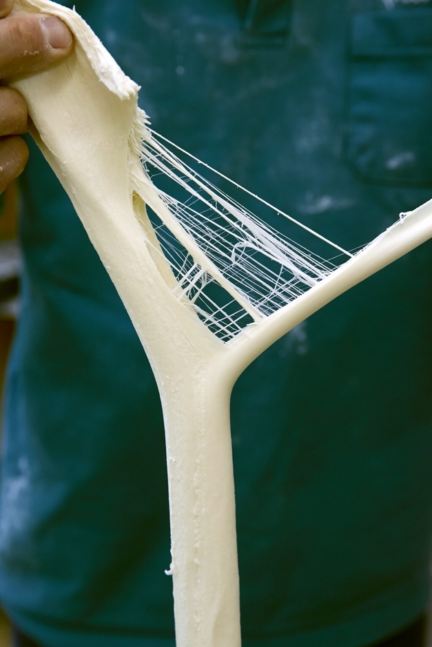 オカベの麺は、徳島県半田に約300年続く伝統製法で作る、一般的な素麺よりは太く、うどんよりは細い手延べ麺です。“ねじって、鍛えて、延ばす”を何度も繰り返しながらできあがる麺は、最終的に1本に18もの麺の層になります。麺を休ませながらこの工程を丁寧に行うことで、ソフトでありながらもコシの強い麺ができあがります。