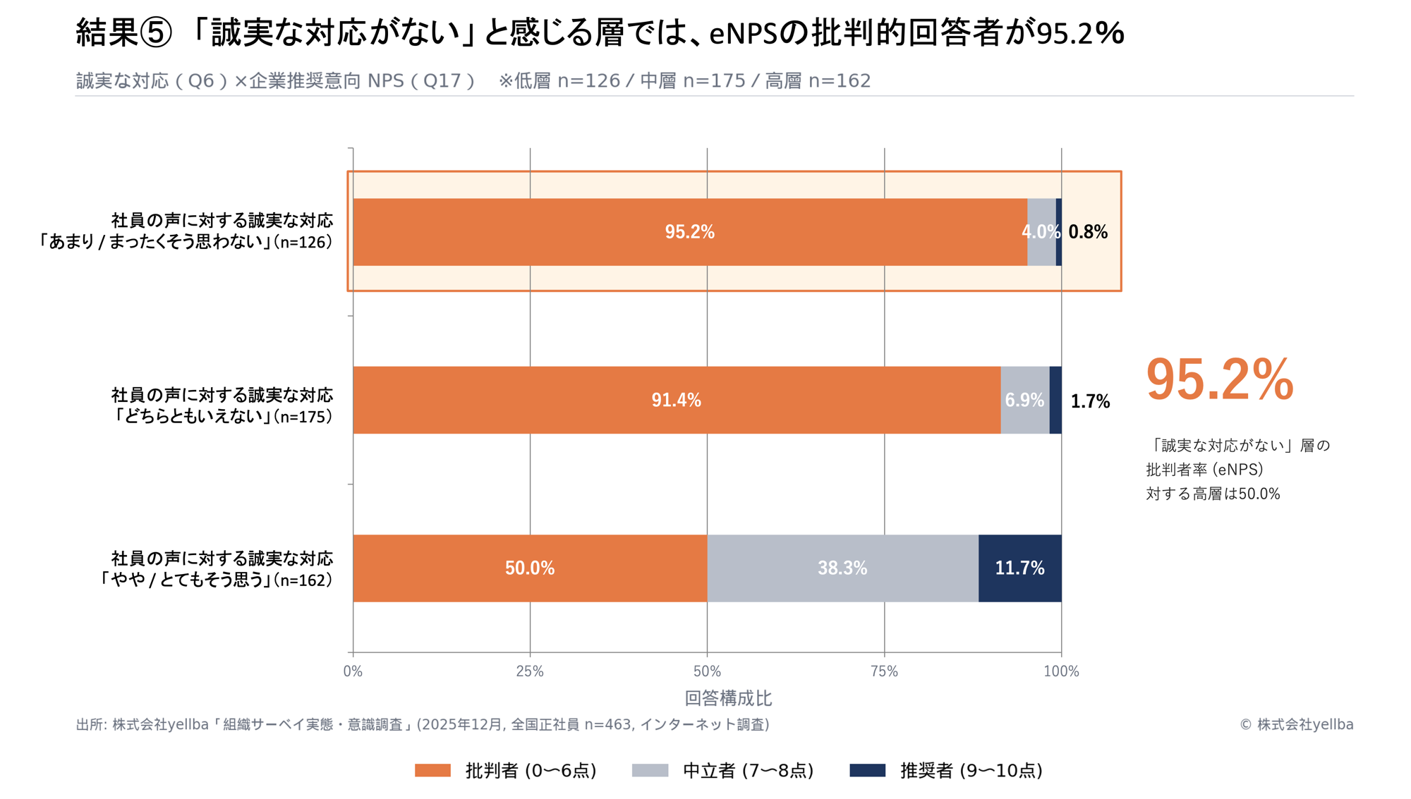 - 職場推奨意向(eNPS)の崩壊:誠実な対応がない組織では「批判者」が95.2%に