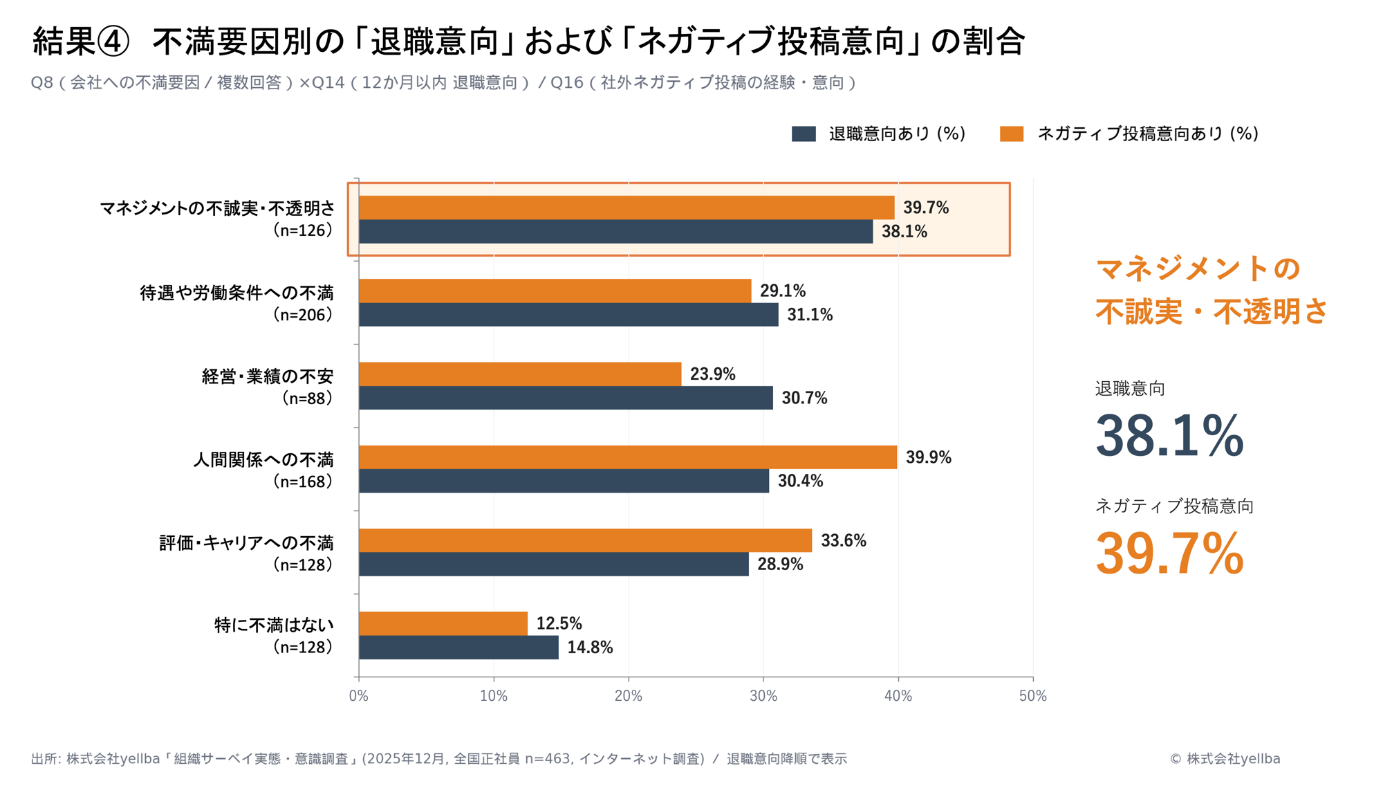 会社に対する不満要因として「マネジメントの不誠実・不透明さ」を挙げた層では、退職意向が38.1%、ネガティブ投稿意向が39.7%といずれも高い水準となりました 。これは給与や労働条件といった外的要因以上に、「自分たちの声がどう扱われるか」という姿勢やプロセスへの不信感が、具体的な離職や情報発信行動に強い影響を与えている可能性を示唆しています 。